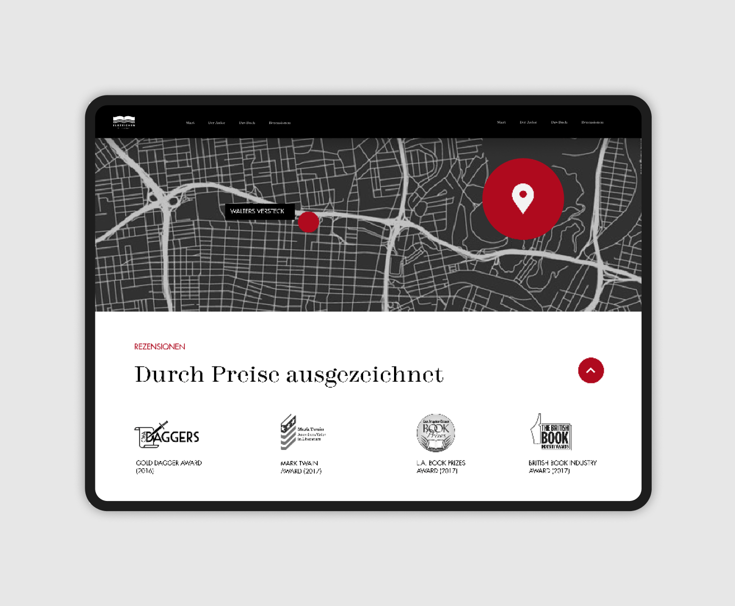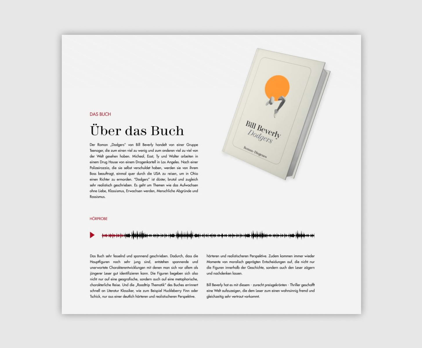 As part of a school project, a thematically appropriate website was developed based on the novel „Dodgers“ by Bill Beverly. In order to create a design concept that consistently represents both the mood and the feeling of the book, an analog mood board was first created on paper. This was followed by the design of a responsively optimized one-pager website, which explains the content and reading experience of the book and also serves as an additional advertising platform for the novel and author.