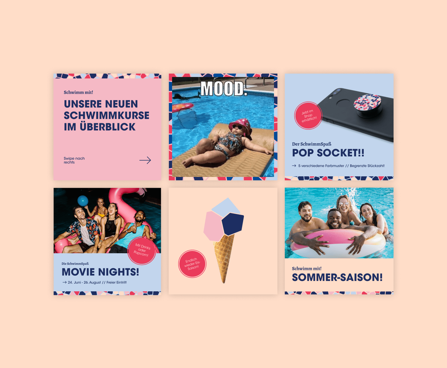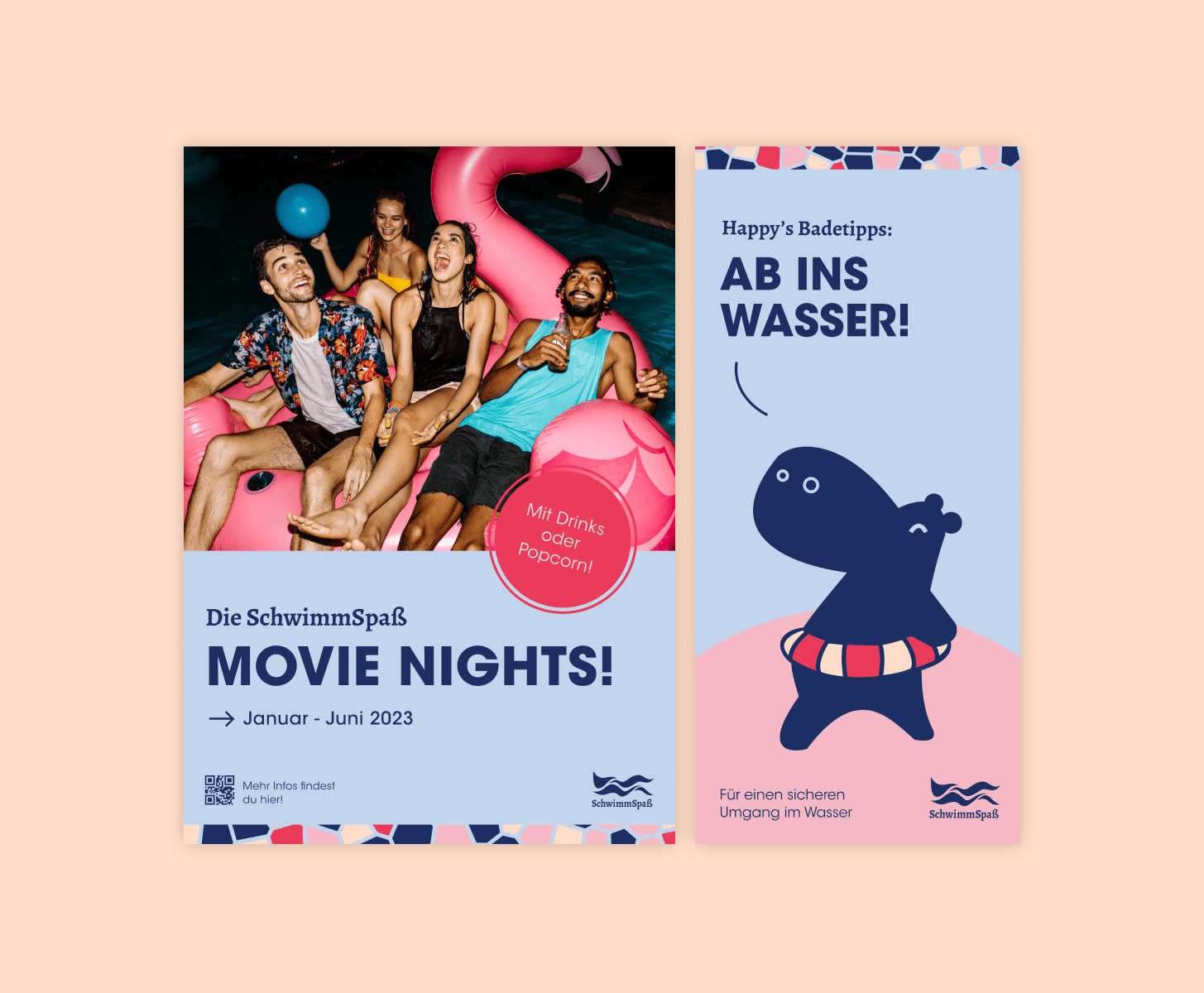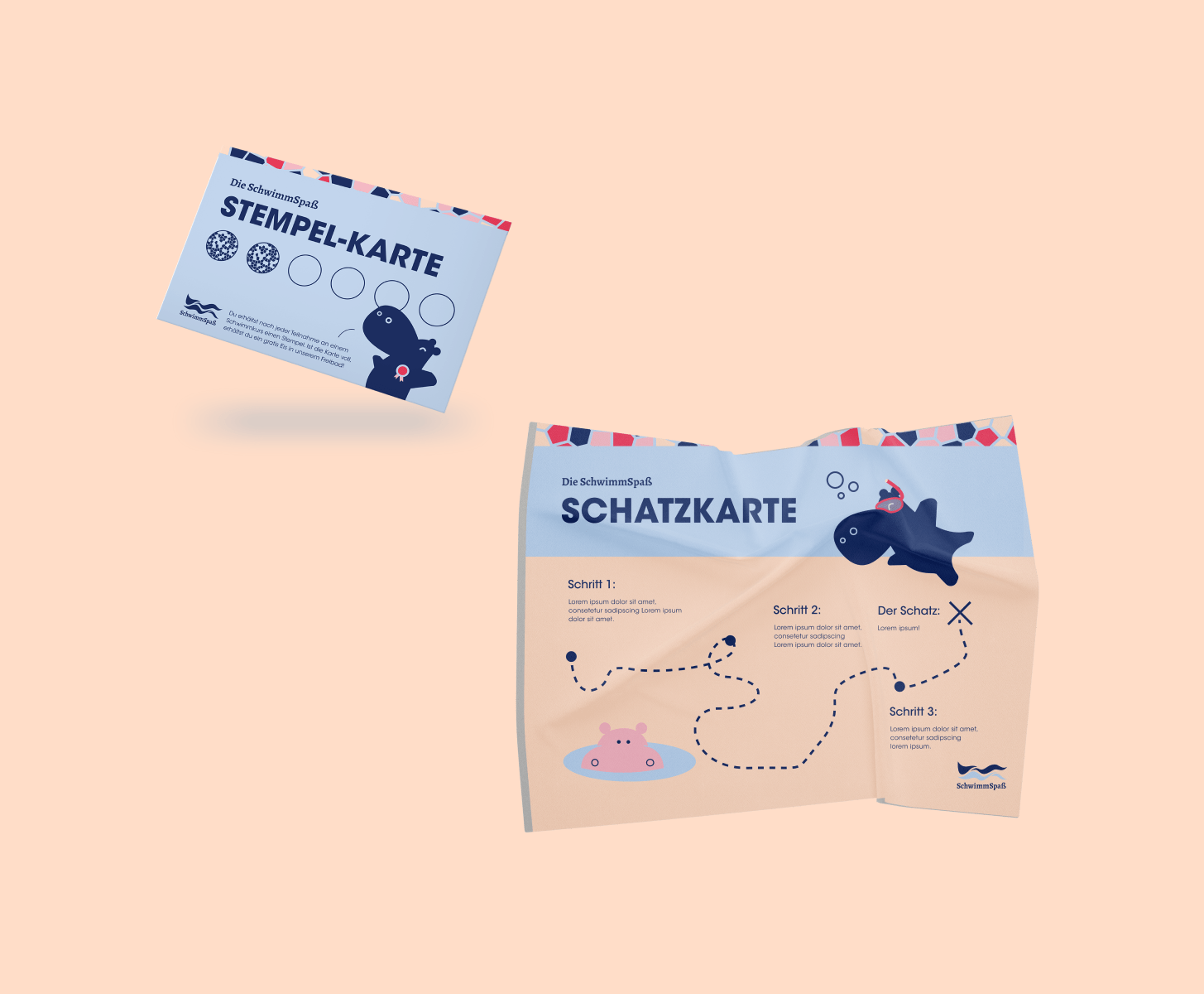 A cross-platform motivational campaign was created for Schwimmspaß GmbH. After the creation of a uniform design concept, in which colors, typography, patterns, a mascot and other design elements were defined, the concept was applied to numerous advertising materials. These included several advertising posters, swimming passes, treasure maps, certificates, cardboard stands, stamp cards, leaflets, a social media campaign and much more.
