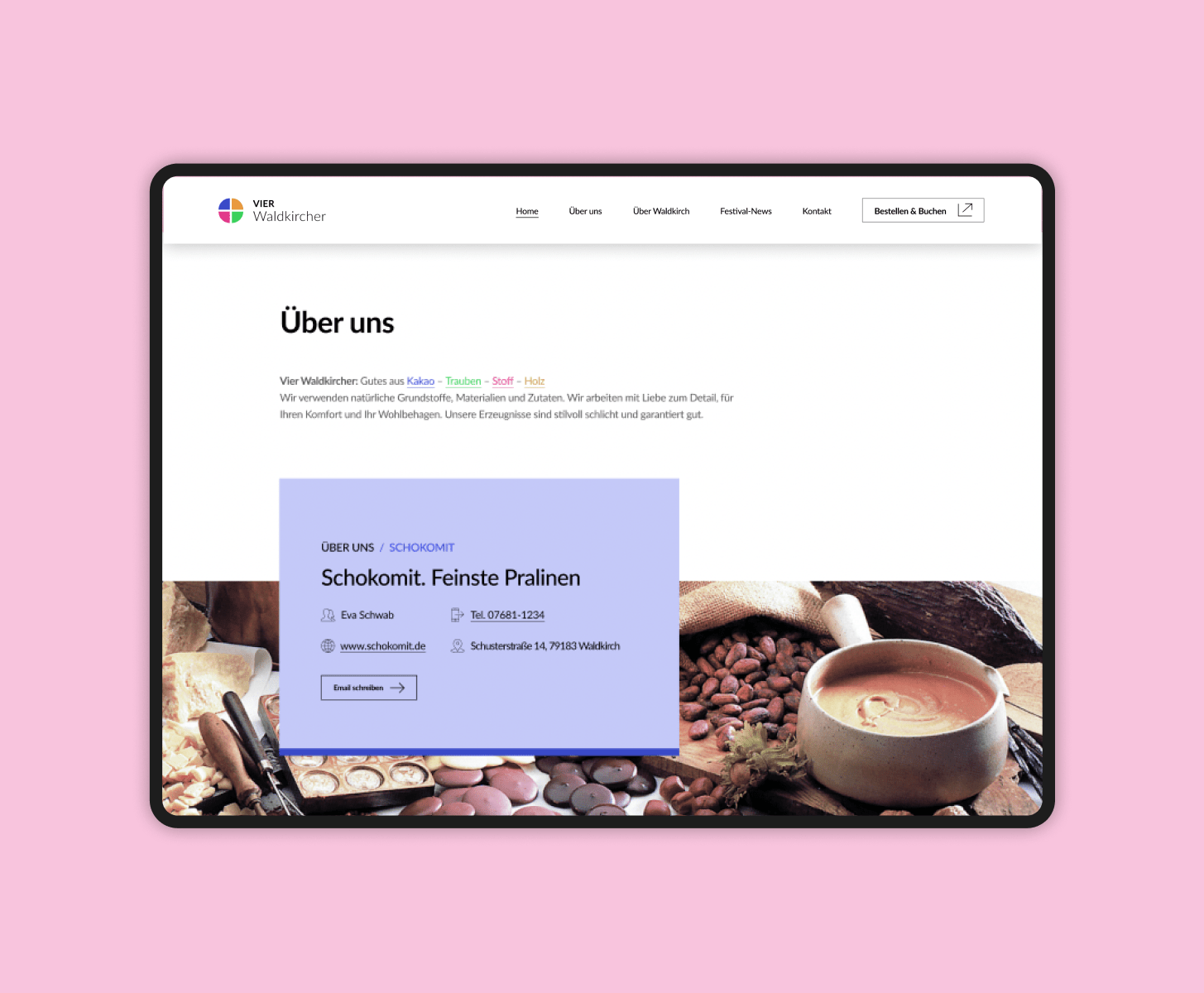 For the „Waldkircher GmbH“, a fictitious association of four craft businesses, a new logo was implemented together with a responsively optimized one-pager website. With the new logo and the modern-looking „Lato Font“, a new color and navigation concept was also implemented within the website, which represents all the individual businesses of the collective equally. The modernized design approach was also explained and recorded in a detailed design concept.